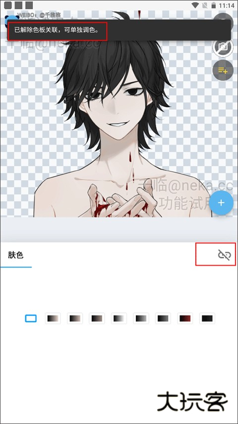 4、如果想单独进行调色,就可以点击肤色右边的链接功能图标,上方就会有文字提示你可以单独调色