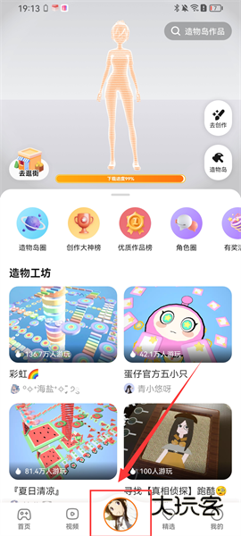 4、随后点击下方的人物头像栏目,给大家提供了造物岛功能,用户可以自由的给角色捏脸、换装以及地图创作等,自由度超级高,还能叫上好友一起玩耍哦!