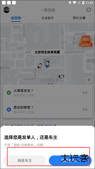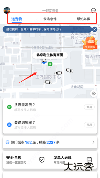 4、在主界面中即可查看到附近的专车,而在上方可根据自己的选择送宠物、长途急件、帮忙办事等需求;