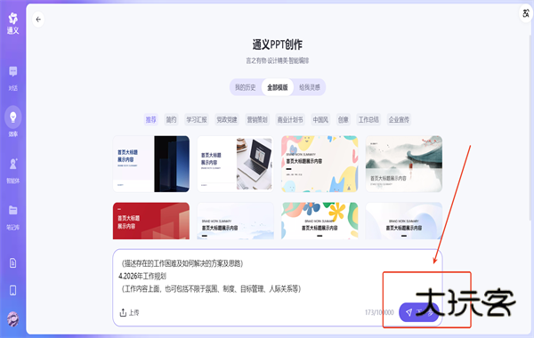 1.进入软件在下列对话框中输入你ppt框架,点击发送。