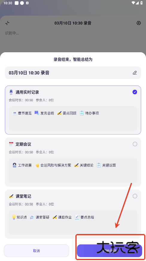 5.或者点击右下角的结束键后,点击开始总结,通义也会帮你转文字的。