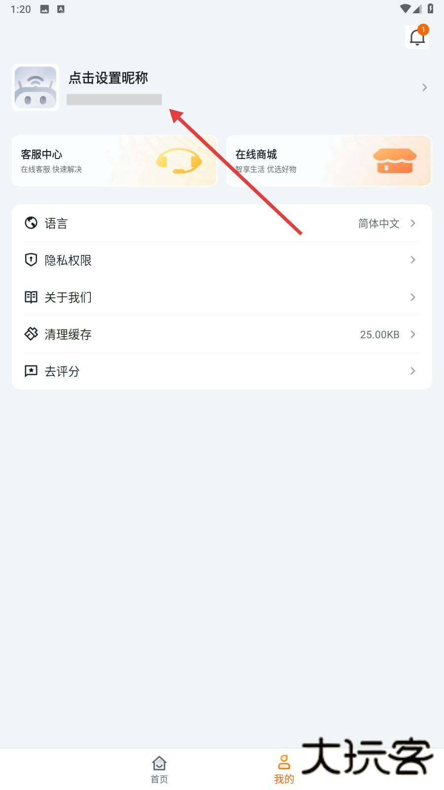 2、进入【我的】页面后,再点击【点击设置昵称】区域,进入个人中心页面啦。