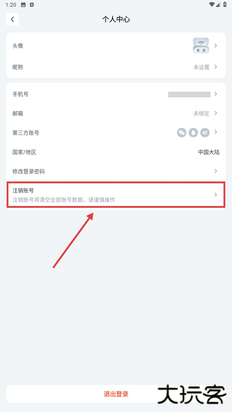 3、在个人中心页面,能看到头像、昵称等设置项,我们找到【注销账号】选项并点击,进入注销界面吧。