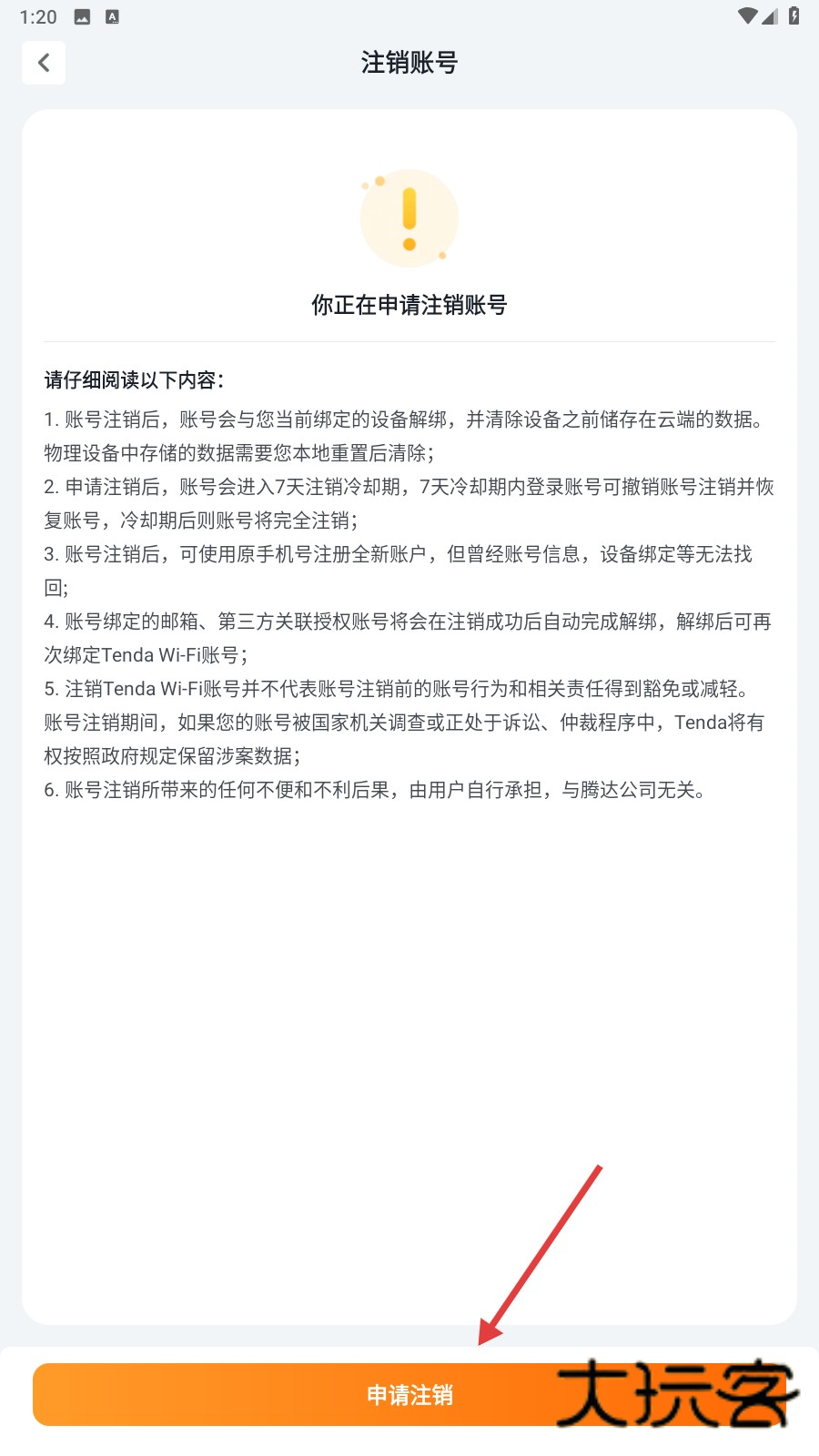 4、到注销账号页面,仔细阅读账号注销的相关须知后,点击底部【申请注销】按钮,即可发起账号注销申请啦。