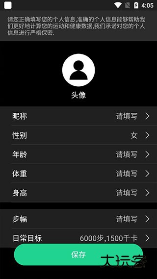 2、初次使用会弹出信息填写,可以输入昵称身体以及运动等信息,点击保存。