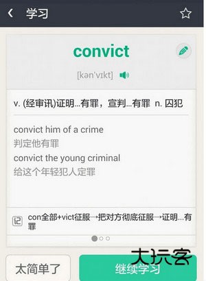 4、轻触屏幕,会弹出相关解释和短语。可根据自己的熟悉情况选择太简单了和继续学习。每天完成任务后可以打卡,打卡可以获得知米豆。知米豆可以购买其他的教材和参加一些知米的相关活动。