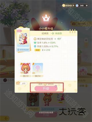 14、点击可以升级的小小樱,点击“升级”即可解锁新的战斗服