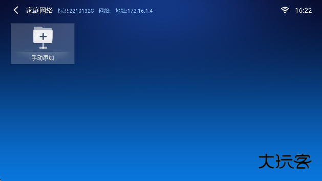 4、家庭网络:点击家庭网络需要手动进行添加,输入设备的地址完成添加即可,设备地址到需要添加的设备上查看。
