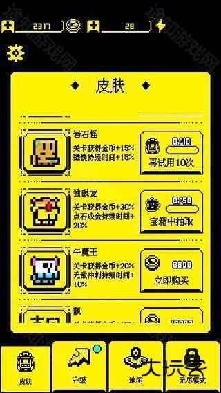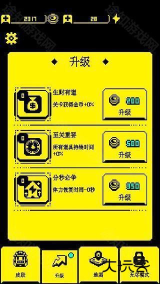 额外,玩家可通过累计的金币进行升级,升级方面有三种选项,分别是生财有道、至关重要和分秒必争。