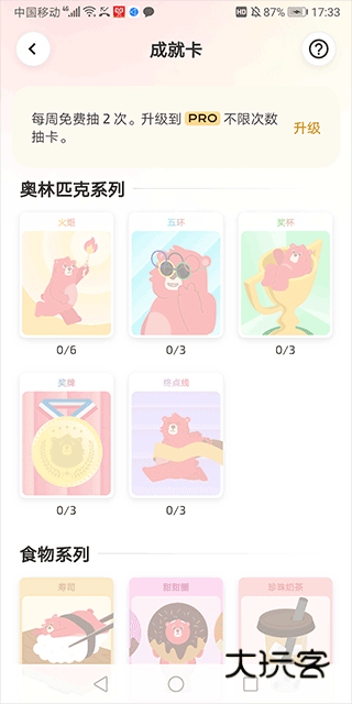 • 有许多系列的成就卡,比如食物系列、奥林匹克系列、节日系列,在完成不同运动目标后可以进行抽卡,每次抽卡的卡面设计都不一样。