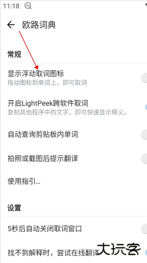 3、开启显示浮动取词图标,拖动图标到单词上,即可取词
