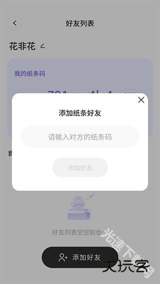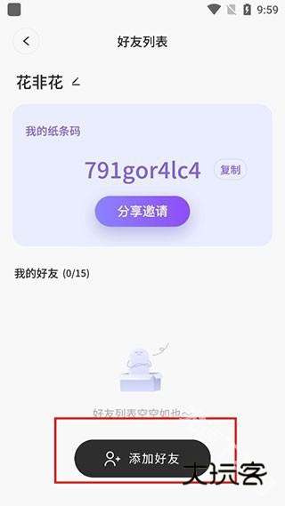 4、可以看到自己的纸条码,点击“分享邀请”,可以发送到第三方平台给好友。也可以点击复制,把纸条码发给好友。还可以点击底部的“添加好友”,进入。