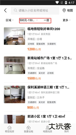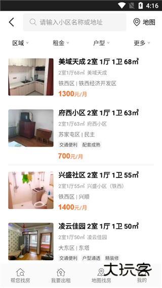 2、用户可以输入自己的小区名或是更具区域、租金和户型来筛选你想要的租房类型;
