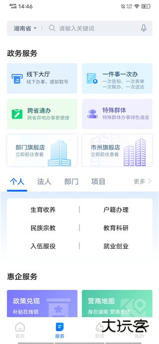 全面的办事服务:APP接入了46个省直厅局的服务,无论是个人事务还是企业开办,很多都能在手机上直接完成或预约。