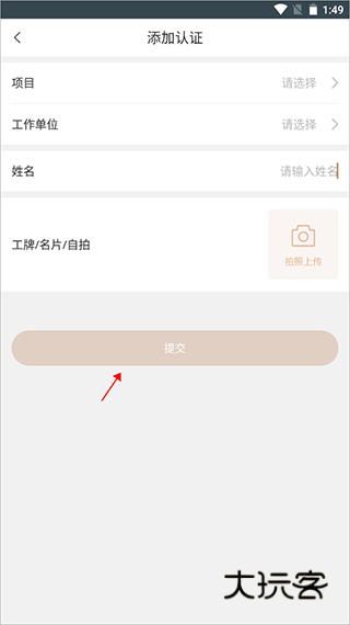 3、按界面要求选择项目、工作单位、输入姓名,上传工牌,最后点击“提交”等待系统通过即可成功进行认证
