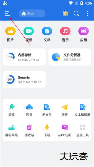 1、打开ES文件浏览器,点击页面左上角的“三”;