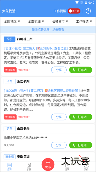 大象找活为有找活需求的工程机械工作者提供了一个安全可靠的平台,机主可以在这款软件上发布工作岗位,通过智能推荐算法,快速找到符合自己需求的好工人。用户可以在软件上通过分类和关键词筛选感兴趣的岗位,有任何问题都可以与用工方直接沟通交流,相当方便。软件减少了找工和用工之间的沟通障碍,让双方用户都能享受更公开透明的服务,有需要的小伙伴快来本站下载体验一下吧!