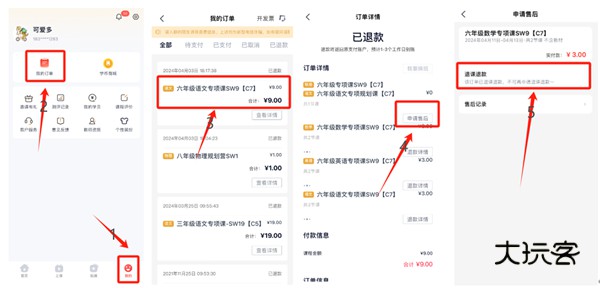 1、登录【途途课堂】app后点击我的-我的订单-点击要退款的订单-点击申请售后-点击退课退款