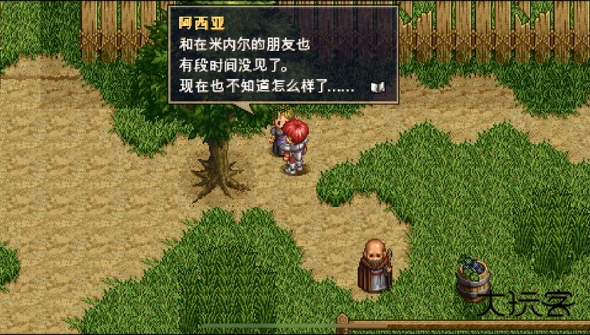 撤出矿坑回到米内亚城,由右上角的门爬上城墙可以找到在那里看风景的女诗人蕾雅,将那把口琴还给她,她为亚特鲁吹奏了一支曲子。(图片:YS0026)来到巴尔巴多村去找布鲁多医师,在医所里见到了卢达,可他不承认自已患了梦游症,道谢之后推门而出。返回米内亚城西北方的草原,在矿坑的左边找到一株萝妲之树,轻轻从草原吹过来的凉风,摇动着大树的枝梢,从风中传来的声音似在与亚特鲁倾诉着什么,那大树自称是萝妲,在伊苏时代由女神创造而生......从它的话中好象还有一棵,接下来找第二棵,往东过桥南行找到另一棵萝妲之树,它说有一股势力苏醒了,伊苏的恶梦也苏醒了,这时从大树的根部发出银色的光芒,亚特鲁在那里找到了一把银剑。接着从左上边的小道走出去,从一个宝箱中找到一张写满文字的纸片,返回去可在路上找到一只宝箱,从里面得到贝斯提里药。回到米内亚城将那张纸片交给蕾雅,原来上面写的是她的一首诗。