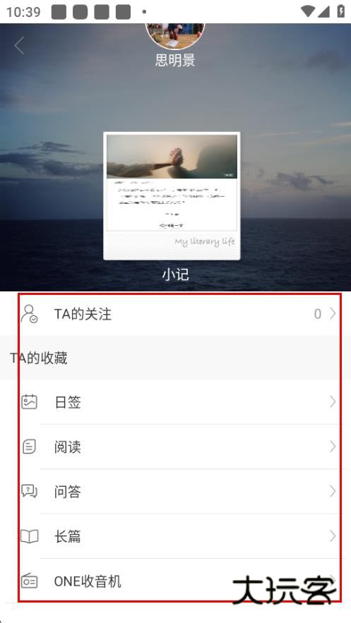 4、进入该用户的主页后,就可以查看TA的关注、TA的收藏 ,以及该用户在日签、阅读、问答、长篇、ONE收音机相关内容。