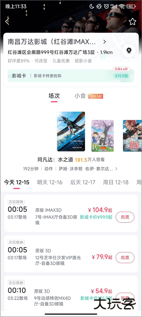 4、进入一家电影院后可以查看到近几天的播放的电影、场次和开场时间,点击右边的购票。