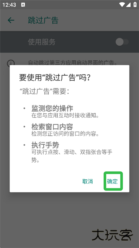 完成以上两步后,应用就会在后台自动运行。之后,当您在观看视频或使用其他应用时遇到带有“跳过”按钮的广告,AdSkipper 就会自动为您点击跳过。