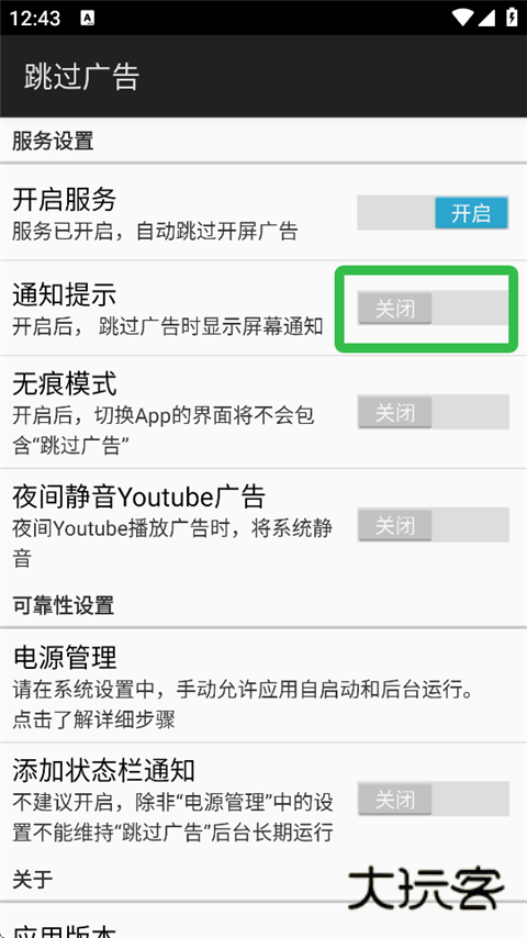 6、用户也可打开通知提示开关,在跳过广告时会进行弹窗提醒。