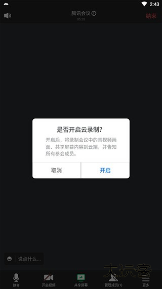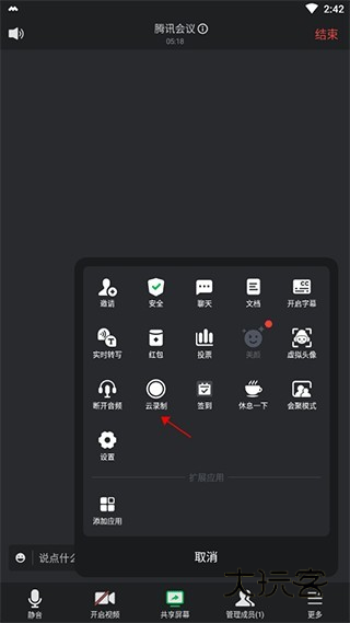1、打开腾讯会议,进入会议界面选择更多,在弹出的选项菜单中点击云录制的选项。
