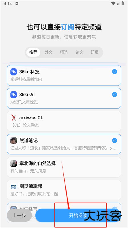3、可以先订阅自己喜欢的频道,然后点击开始阅读