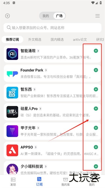 7、还可以在广场页面点击加号关注自己感兴趣的