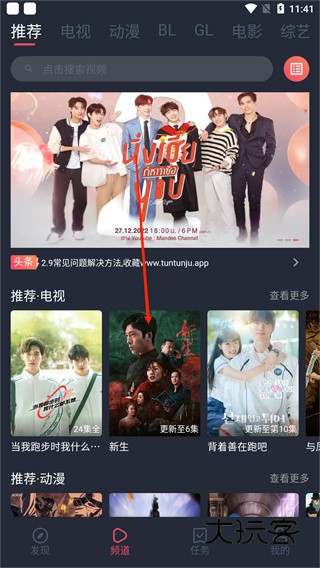 1、在“频道”页面的搜索框中,搜索自己想看的剧或者电影、综艺;