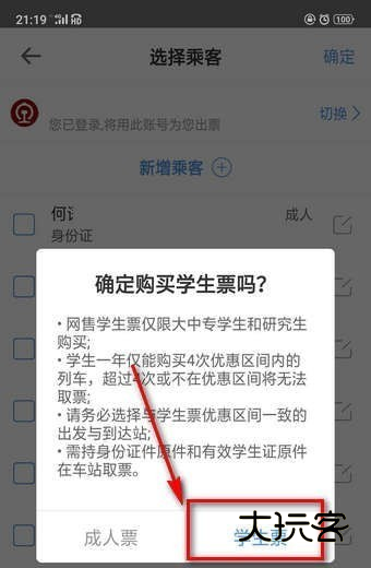 7、这样在智行火车票上抢票,点击乘客就会出现确定购买学生票的提示,抢的票就是学生票的价格啦。