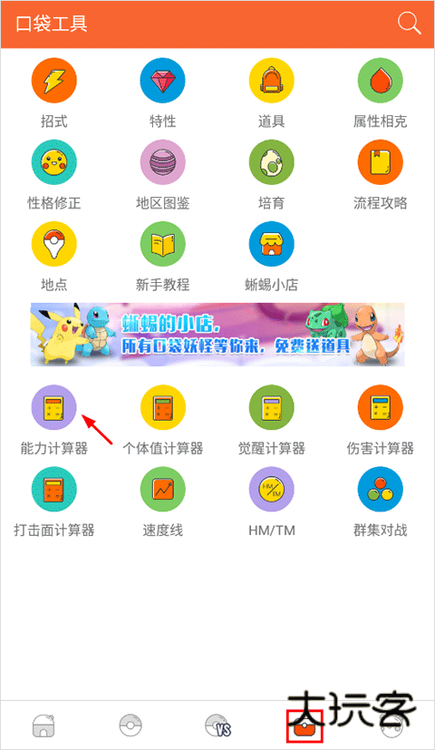 1、首先打开口袋妖怪图鉴app官方版,在口袋工具模块,选择能力计算器;