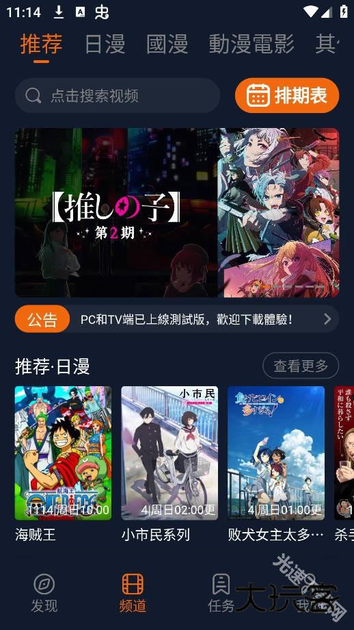 1、打开软件之后会默认进入到【频道】板块,选择想要观看的动漫并点击进入到视频播放界面。