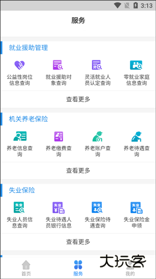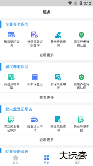 2、在首页有企业养老、居民养老、就业失业、就业援助、机关养老等功能