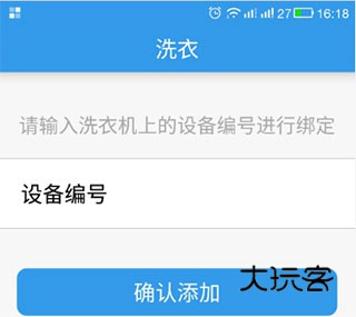 新用户注册登陆后点击"添加设备",并在 跳转页面输入洗衣机上的编号,设备添加成功。