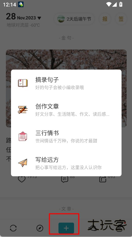 4、点击页面中间的“+”号按钮,即可进入发布界面,自由编辑语录、文字或美图,一键分享到朋友圈,记录并分享当下心情。