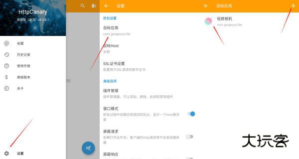 2、然后点击设置-目标应用-添加轻颜相机(为了不抓取其他多余的app的数据,方便找包)