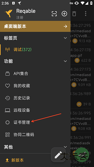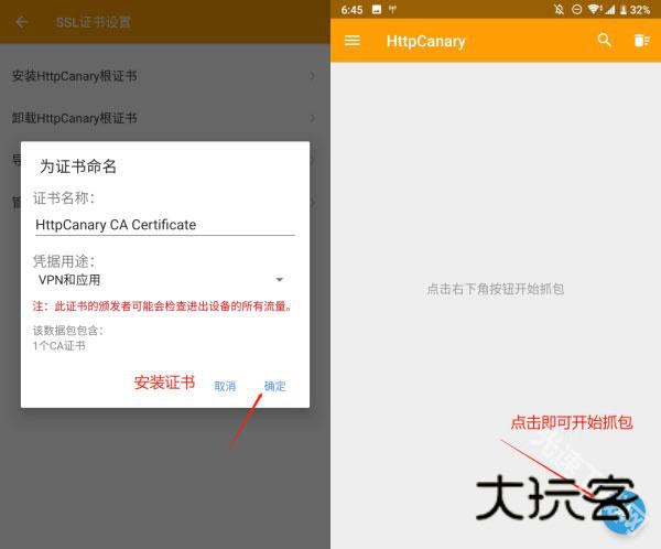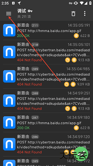 4、如果用户需要抓取https流量数据包则需要安装ca证书,首先需要点击app左上角的扩展功能图标