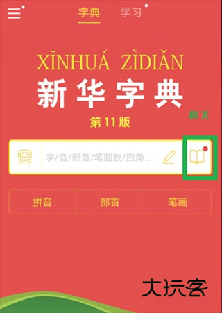 1、点开新华字典的界面,在白框中右侧有个书形的小黄标,点此可以实现屏端直接翻页。