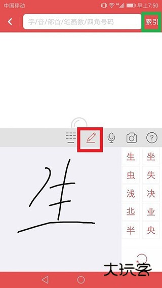 4、若您不知其音,还能点红杆的笔状,将它写入左侧灰幕,格中就会浮出,再点即得知字音了。