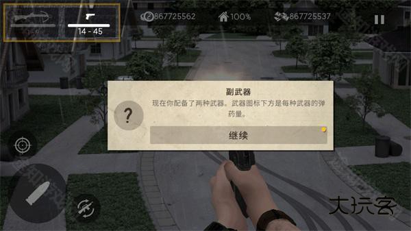 6、现在你配备了两种武器,武器图标下方是每种武器的弹药量,要在武器间切换,可以轻触“切换武器”按钮;