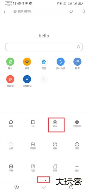 1、打开软件,想要在米侠浏览器里添加脚本的话,可以先点击页面下方的横杠按钮,打开功能列表找到“脚本”功能进行设置。