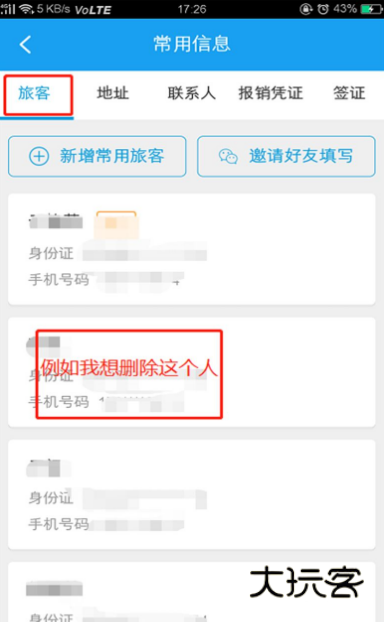 4、在常用乘坐人列表中,找到要删除的乘坐人。