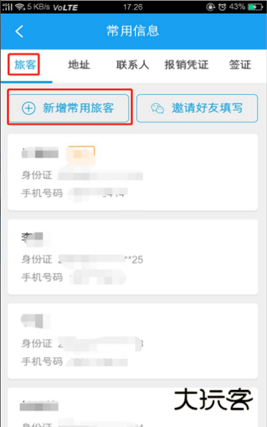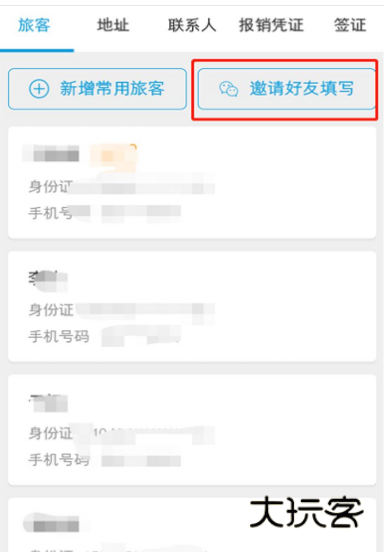 如果想添加乘客也是从【旅客】→【新增常用旅客】。也可以选择【邀请好友填写】,就是微信分享给他,让他自己填信息。