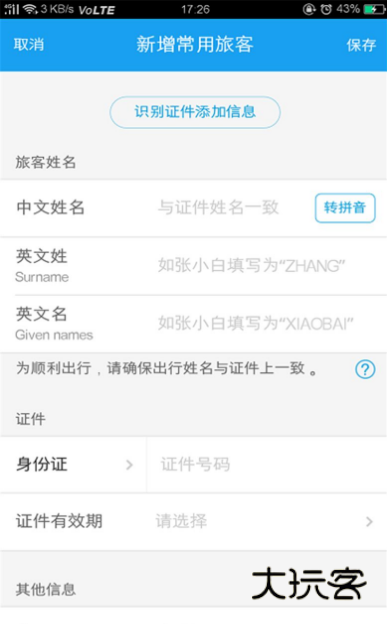 3、填写出行人信息:进入新增页面后,你可以开始填写新出行人的个人信息,包括姓名、证件号码等。确保填写准确无误后,点击“保存”按钮即可。