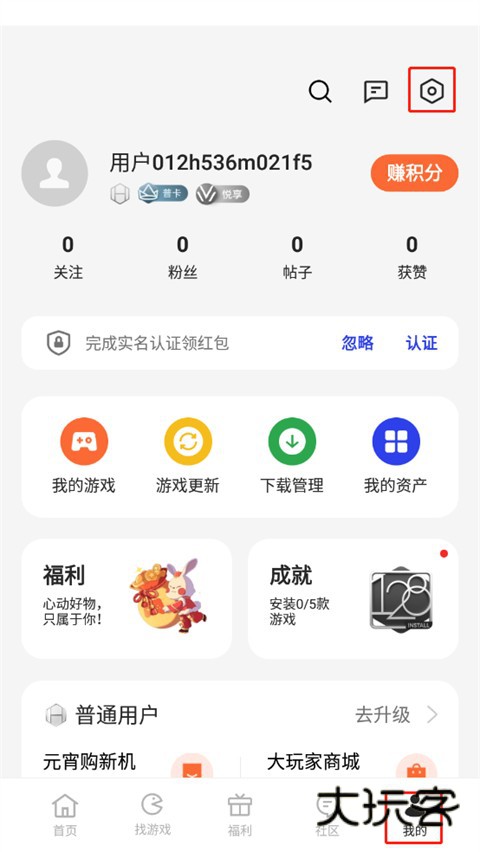 1、双击打开OPPO游戏中心,点击右下角的我的,再点击右上角的齿轮按钮。