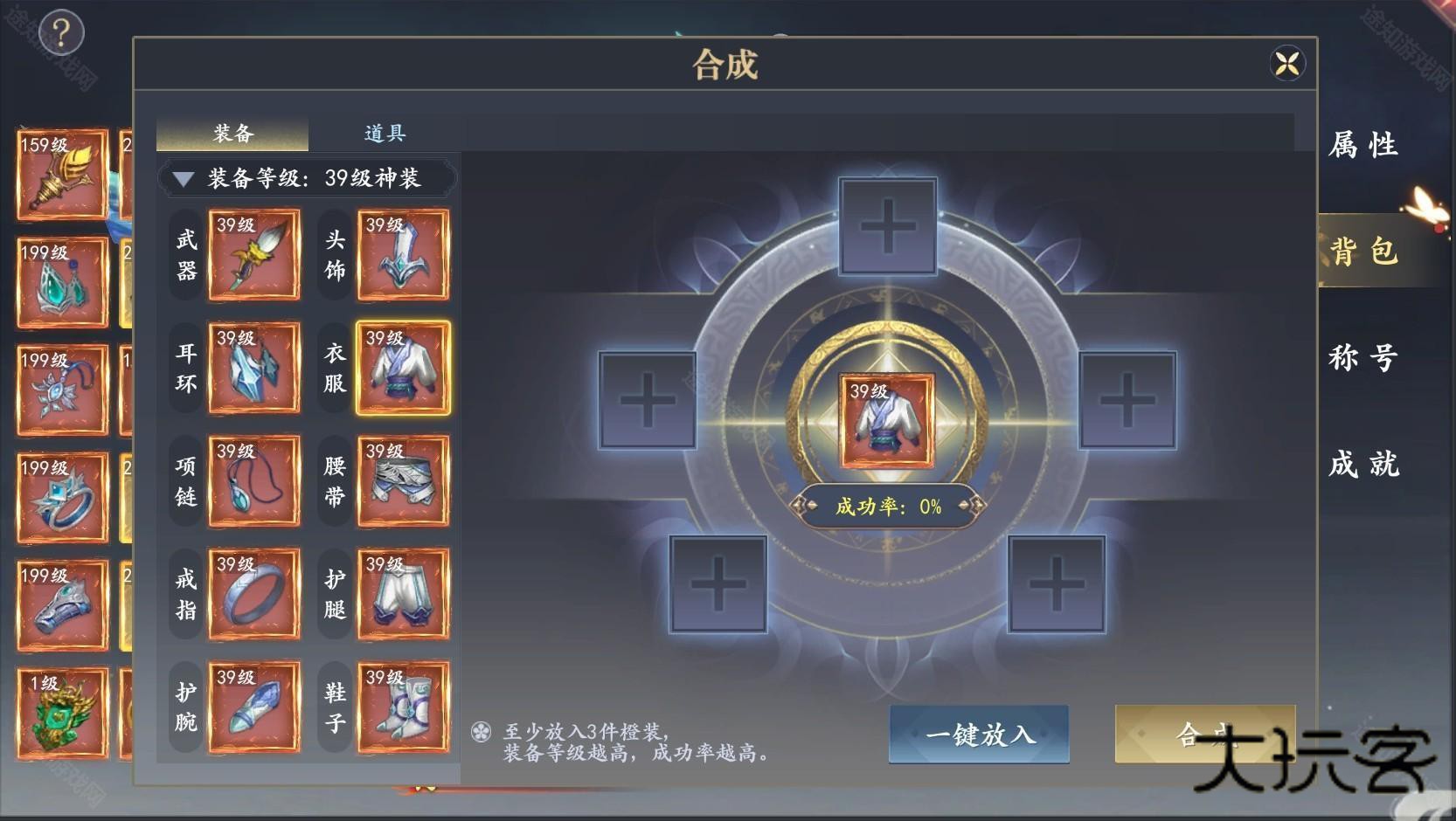 多余的橙装不要急着分解,可在“背包-合成”界面中融合升级,轻松获得更高品质装备。
