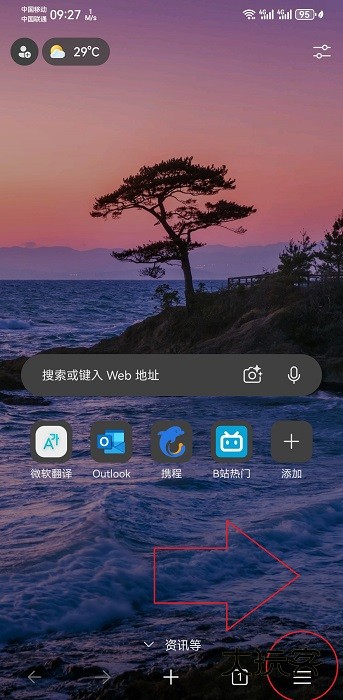1、下载微软浏览器之后打开,点击下方最右侧按钮,如图所示;