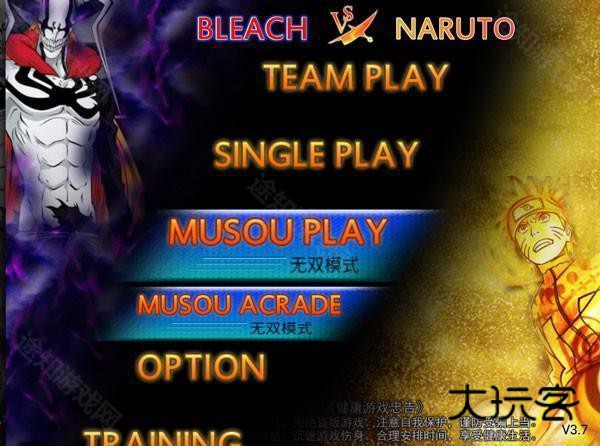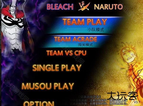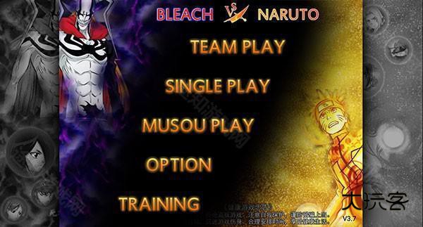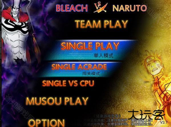 1、打开死神vs火影,进入选择玩法模式,小队模式TEAM PLAY、单人模式SINGLE PLAY、无双模式MUSOU PLAY。